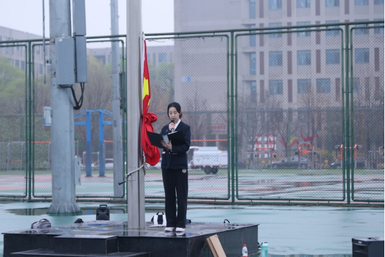七点五分,升旗仪式正式开始,国旗护卫队队员们迈着铿锵有力的步伐,将国旗送至升旗台前,伴随着曲调激昂的《义勇军进行曲》,同学们庄严肃立,注视着鲜艳的五星红旗缓缓升起,迎风飘扬。