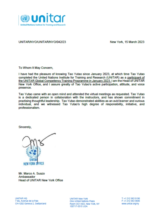 近日,20名同学全部顺利结训,并陆续收到了实训营结训证书和各见习组织出具的见习证书,有3名同学以优异表现获得UNITAR官方出具的推荐信,实训结果丰硕,同学们受益良多。