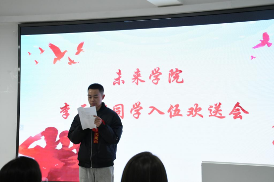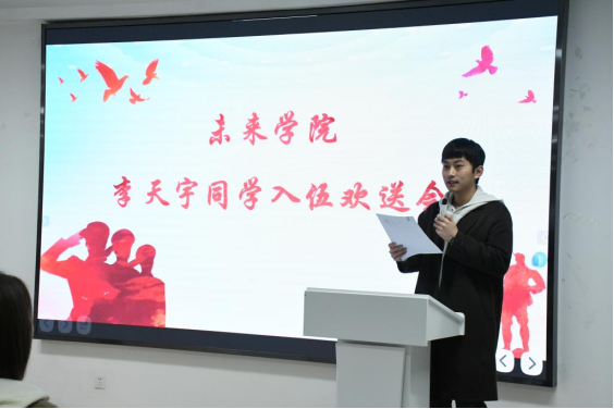 3月5日19:00,未来学院在沙河校区雁南园一站式多功能厅举行2024年春季入伍学生欢送会。学院常务副院长顾仁涛、副院长喻鹏、王文华、学生工作办公室主任张旭伟、定兵入伍学生李天宇和五十余名学生参加了此次活动,本次活动由辅导员杨星义主持。