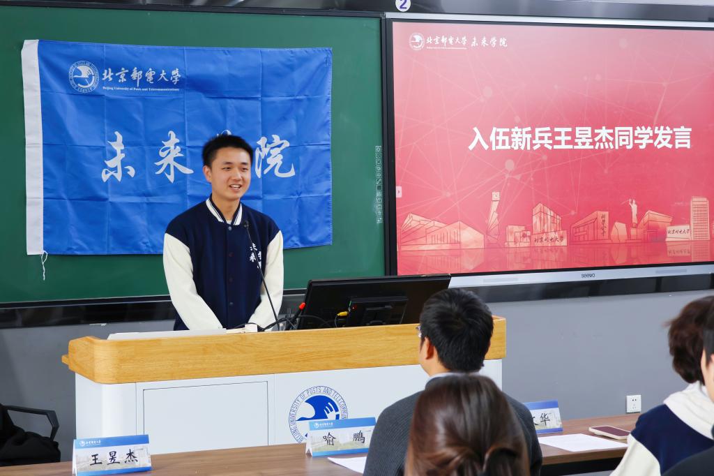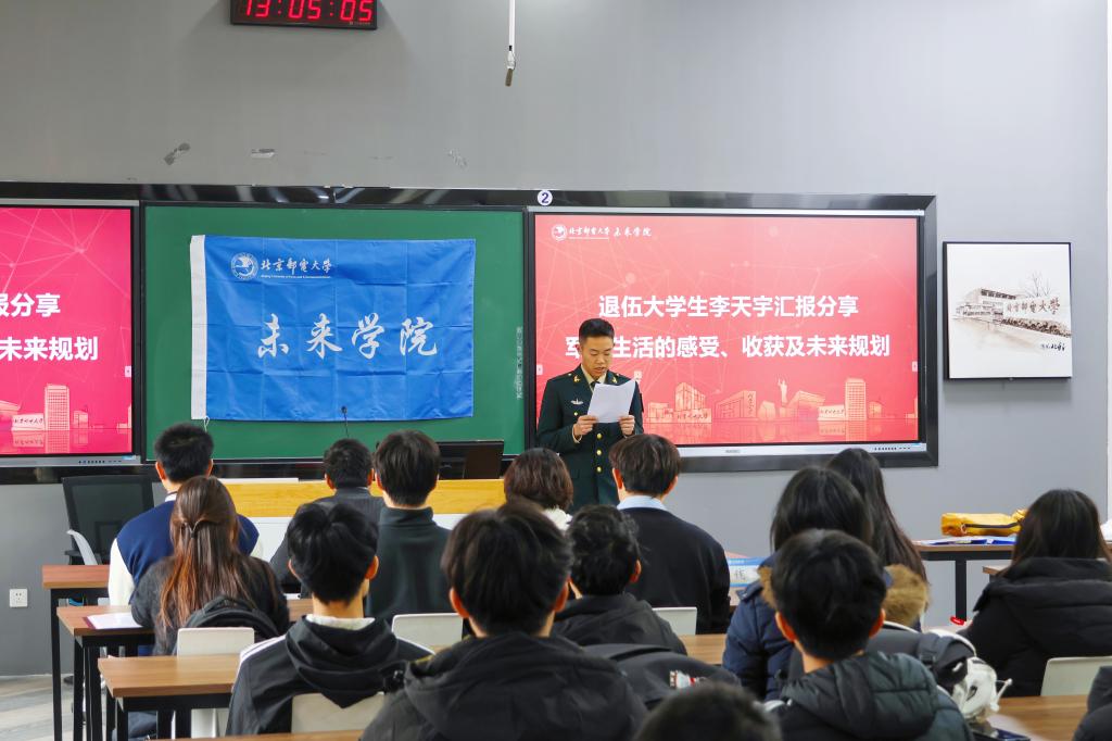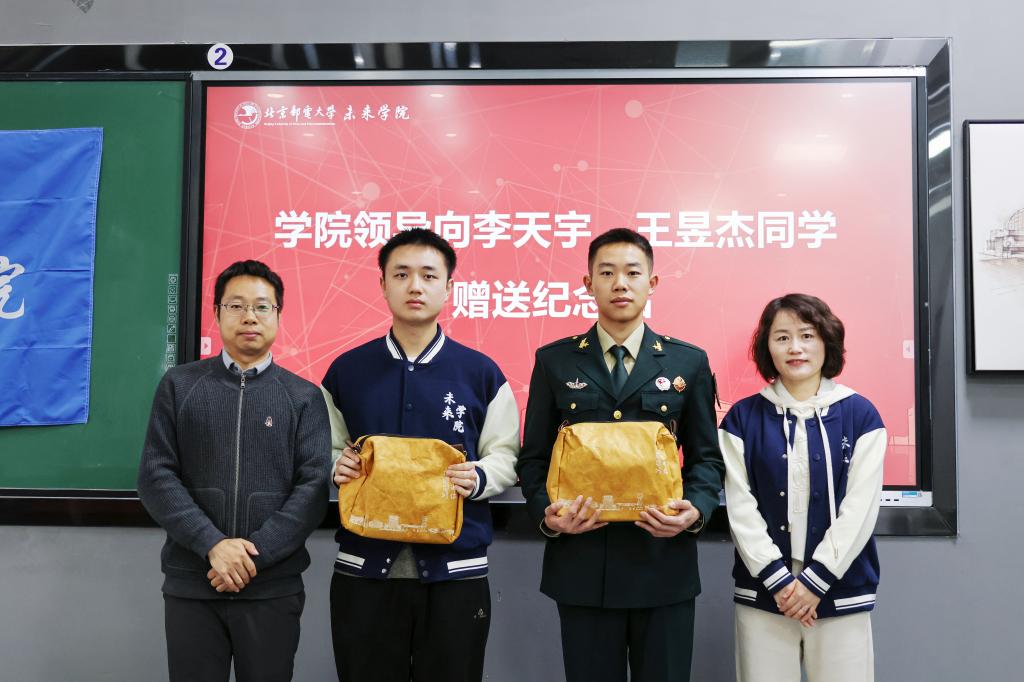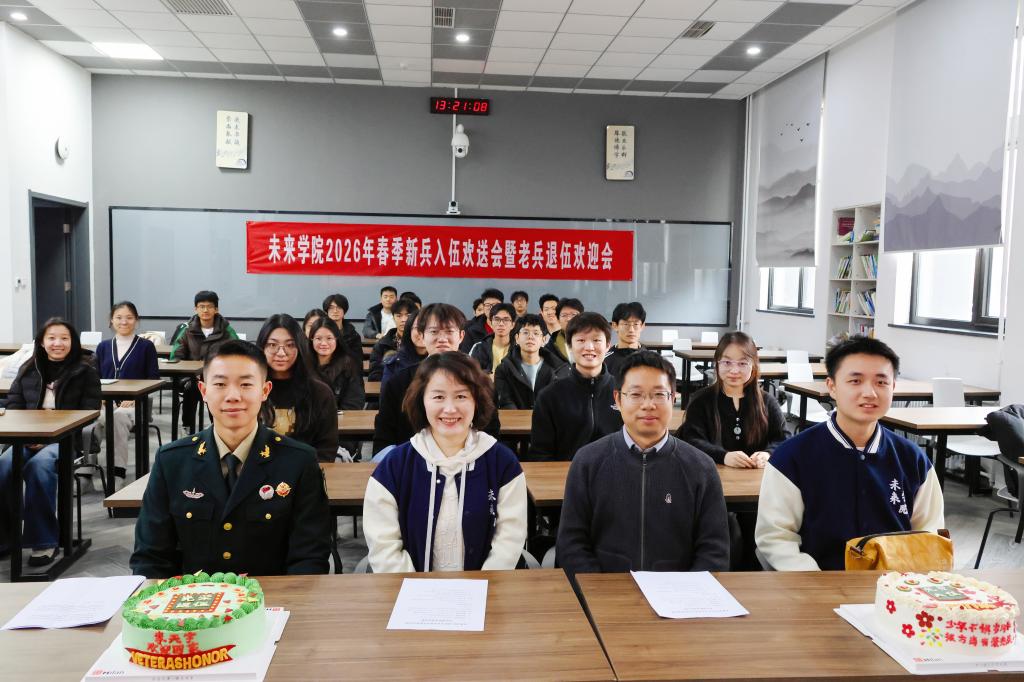 3月13日下午,北京邮电大学未来学院2026年春季新兵入伍欢送会暨老兵退伍欢迎会在S1-105教室隆重举行。未来学院副院长王文华、喻鹏,团委书记兼2024级辅导员董星雨,2025级辅导员钱婧与三十余名学生代表齐聚一堂,迎接载誉返校的退伍老兵李天宇同学,送别携笔从戎的入伍新兵王昱杰同学,本次会议由2025级辅导员苏一涵主持。