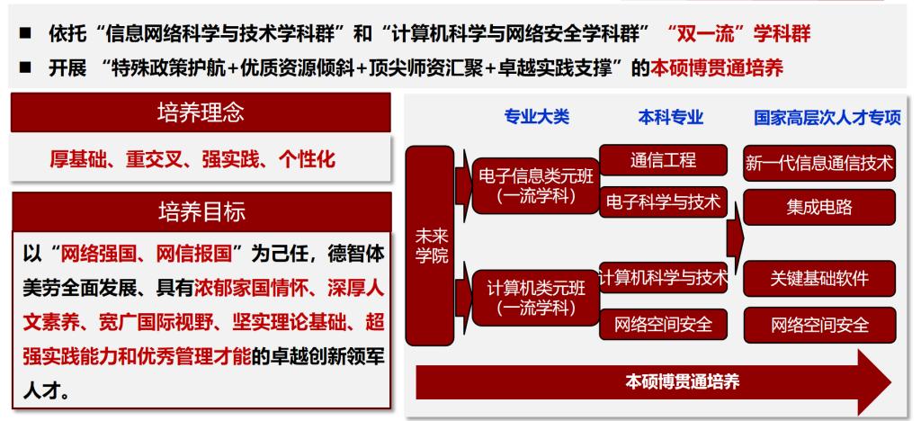 学院重基础,强交叉,依托北邮在信息通信网络的优势,在关键交叉方向和领域,开展本硕博贯通的培养,采用全新的一体化培养方案和课程体系,实施“二制三化”(即导师制、学分制、小班化、个性化、国际化),建设跨学科课程体系,组建跨学科教学团队,实施跨学科创新训练项目;打破专业壁垒,面向行业顶尖人才培养需求,构建新工科建设的北邮模式。