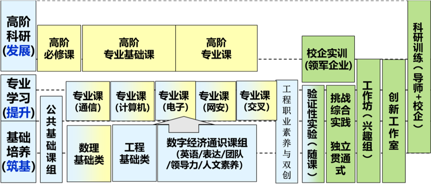电子信息类(元班):信号与系统、通信原理与实践、数字信号处理、电磁场与微波、电子电路基础、数字电路与逻辑系统、微电子器件基础、无线通信、光通信技术、智能信息网络、数字信息编码、综合挑战实践等。